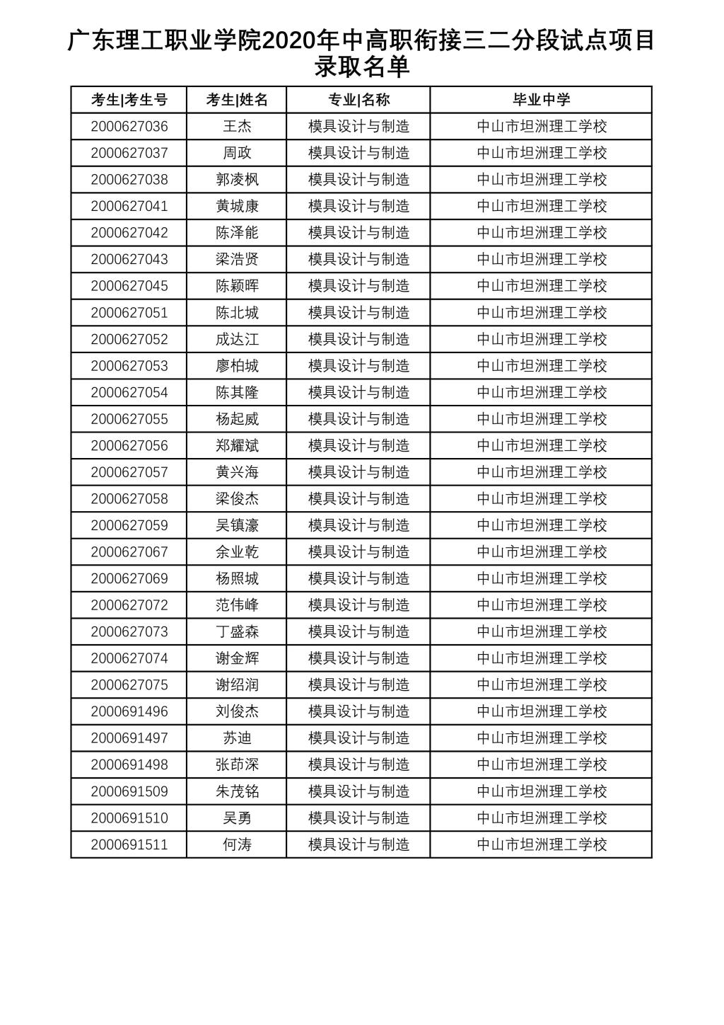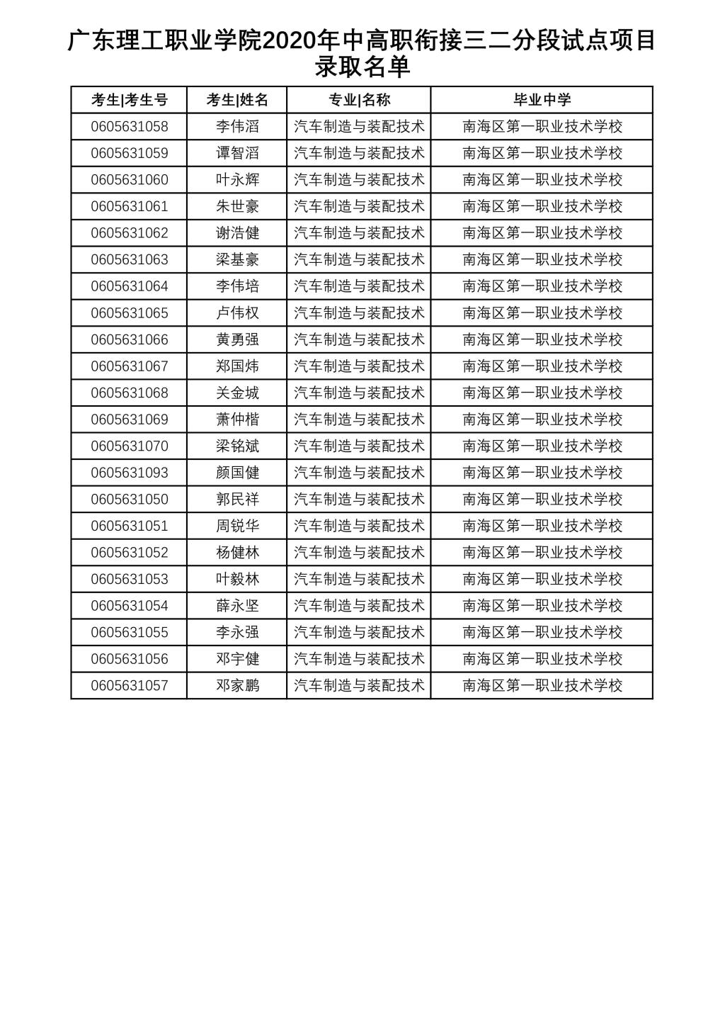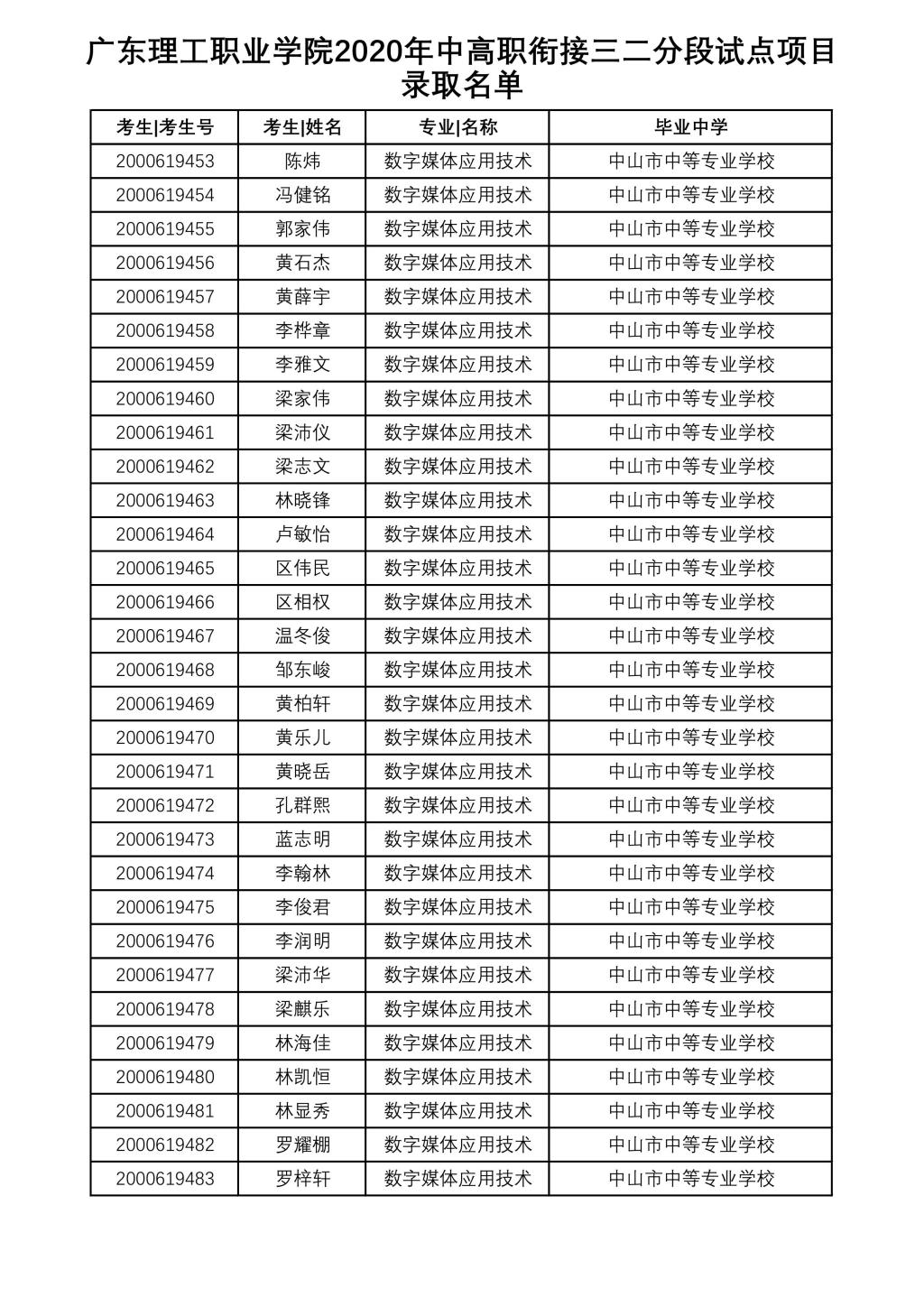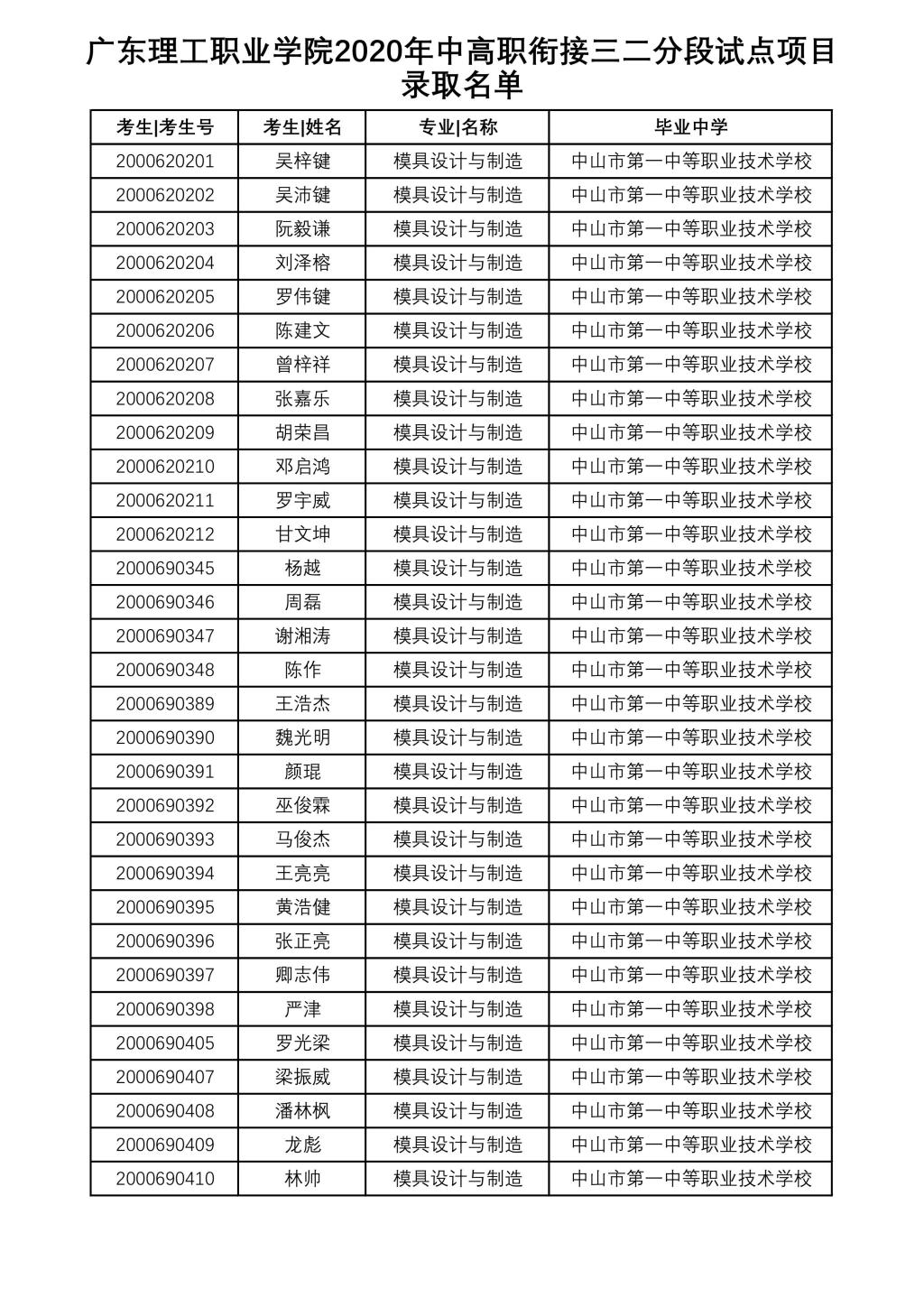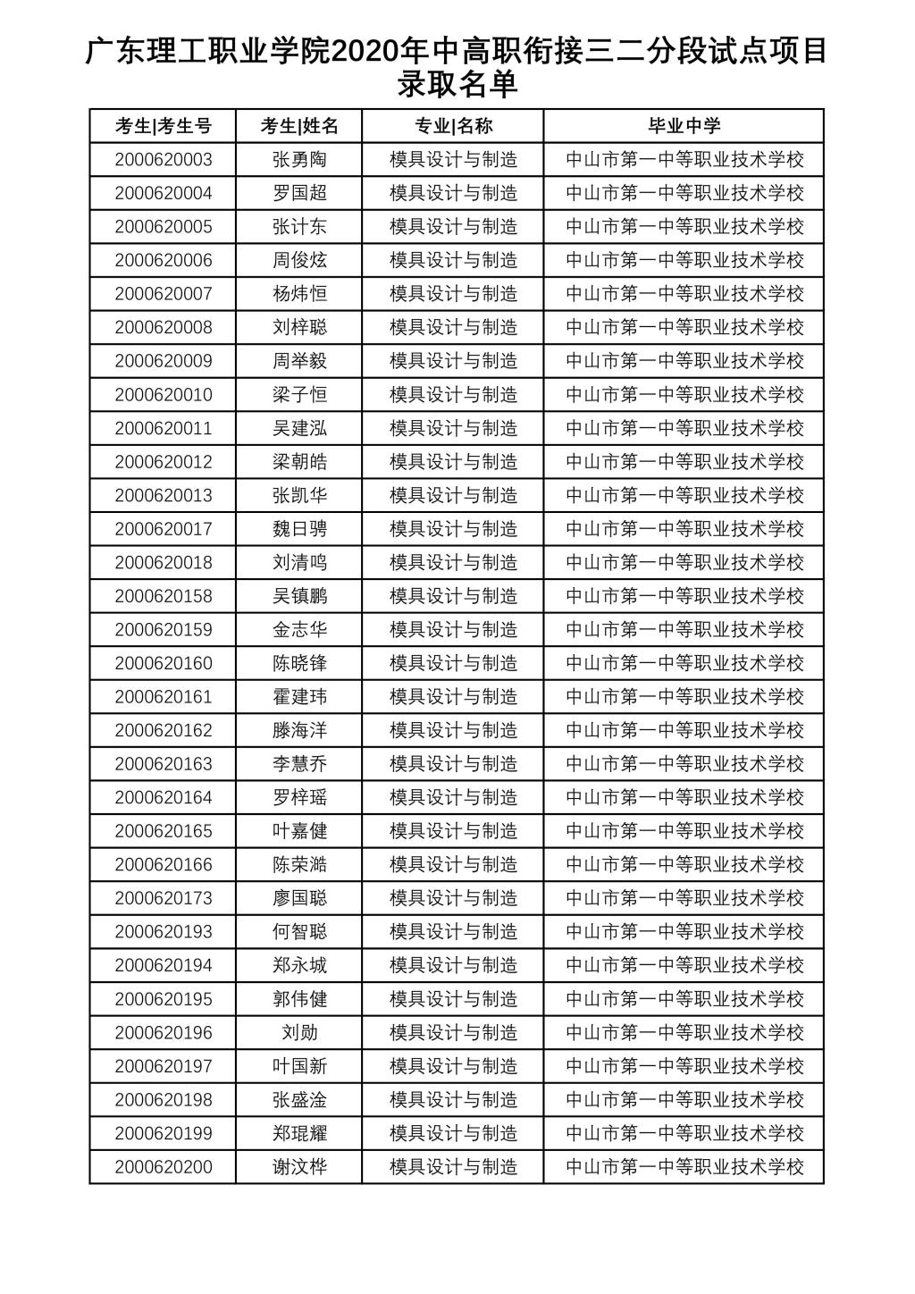 根据广东省招生委员会办公室审核通过,现将我校2020年中高职衔接三二分段录取考生名单公布如下: